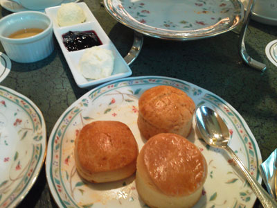 スコーン(ゴルゴンゾーラ、イチジク、プレーン)クロテッドクリーム、ジャム、蜂蜜