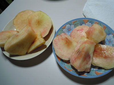 左が頂き物の白桃、右が山梨の桃。