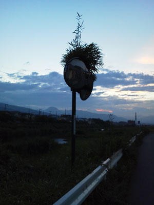 他とちょっと違うのは、カーブミラーの柱の中を竹がにょきにょきと生え、ついにてっぺんからこんもりと顔を出したということです。