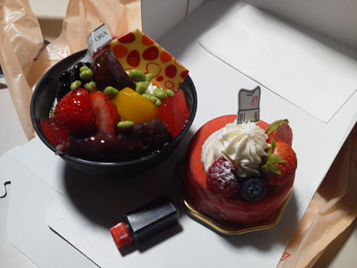 左がフルーツ山盛りの抹茶あんみつ。黒蜜をかけてパクリ!