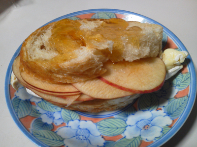 カンパーニュのようなしっかりしたパンで、チーズと林檎の薄切りをサンド!