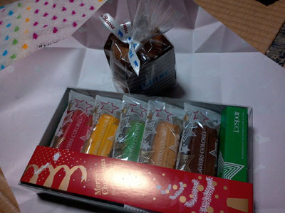 手前は、マカロンみたいにカラフルな生地で5つのそれぞれ異なった味をサンドしたクッキー(?)